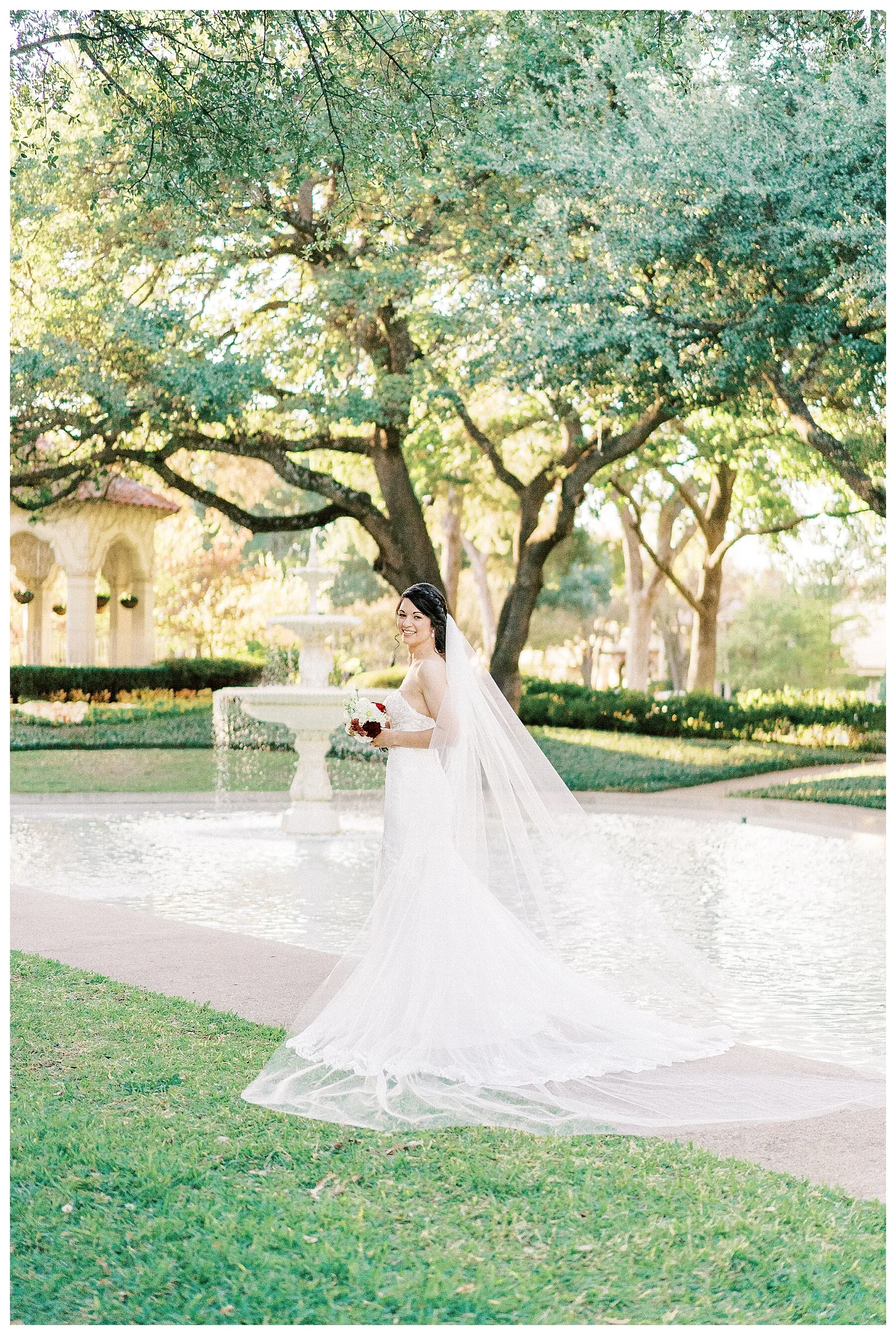 Hello Everyone! Rachel’s Bridal Portraits are HERE!!! I have been wanting to share her stunning Bridal Portraits! We took her Bridals at Flippen Park in Dallas, Texas. Rachel looked so angelic! Rachel wore a beautiful sweetheart neckline lace gown by Stella York. She purchased it from the fabulous Circle Park Bridal Boutique. She paired it with a soft cathedral-length veil. Rachel had her makeup done by the talented Wendy from WZ Beauty Studio. She opted for soft and natural makeup since she mentioned she doesn’t wear makeup on a daily basis, so a natural look was perfect! As for her updo, she went for a soft braided updo. She finished her look with two-tier teardrop earrings and a teardrop necklace. For our shoot, we had amazing light and weather, not too hot nor too cold. The Gazebo was such a pretty spot to showcase her lace detailed gown up close and the foundation was the perfect backdrop to showcase her entire look without taking the attention away from her. Her mom accompanied her and she was the sweetest and most helpful. Rachel wore her smile beautifully making my job so easy!